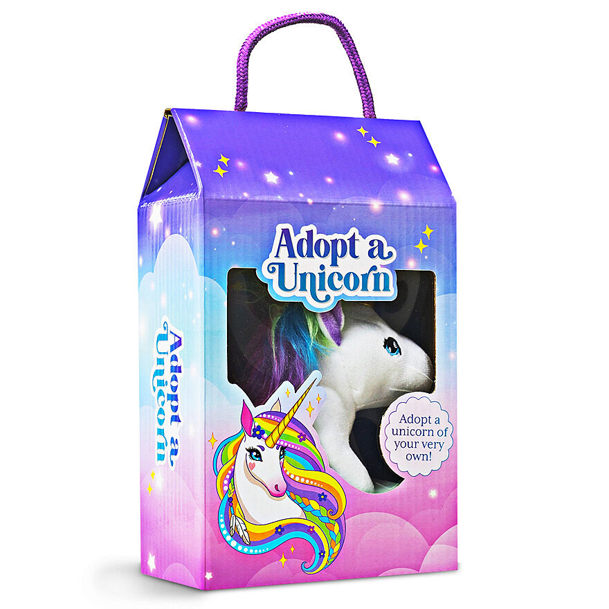 Congratulations on the adoption of your very own unicorn! Inside this carry-along case, you’ll find a sweet plush unicorn to call your own. You’ll also discover a 32-page adoption and adventure guide and an adoption certificate for you to personalize!