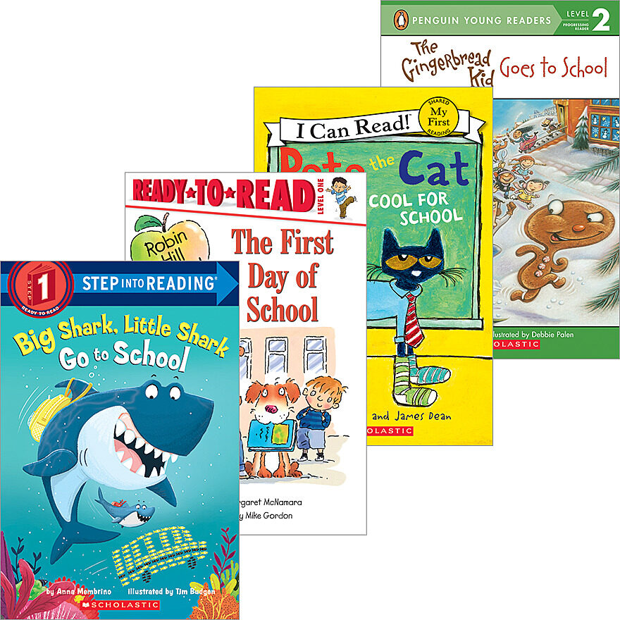 What cool outfit should Pete The Cat wear to school? Will Big Shark and Little Shark be late on their first day of school? Where is the gingerbread kid off in such a hurry? Charles wants to bring his puppy to school but he has to leave him at home. Will school still be fun without his best friend? This pack includes four fun school stories from bestselling series!