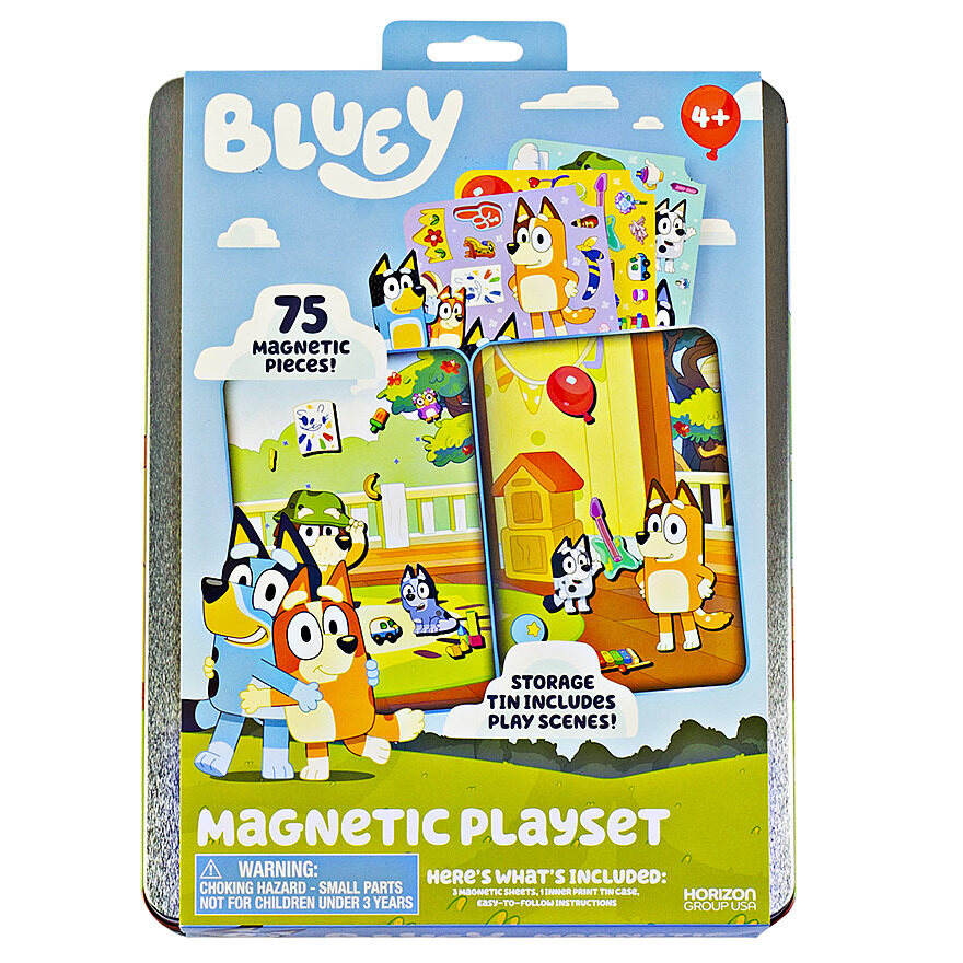 With 75 magnetic characters and accessories, this whimsical playset offers endless ways to learn through play. Punch out your favorite Bluey characters from the magnetic sheet, including Grandad, Nana, Bandit, Chilli, Bluey, Bingo, and Muffin, then place them inside the tin to create your own adventures. Use the storage tin to keep your magnets organized and bring a world of creative adventure wherever you go.
