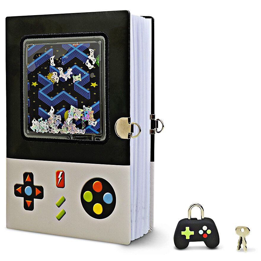 Level up your gaming style with this turbo gaming diary. The cover is filled with liquid and floating gamer confetti! It comes with a special lock that looks like gaming controller.